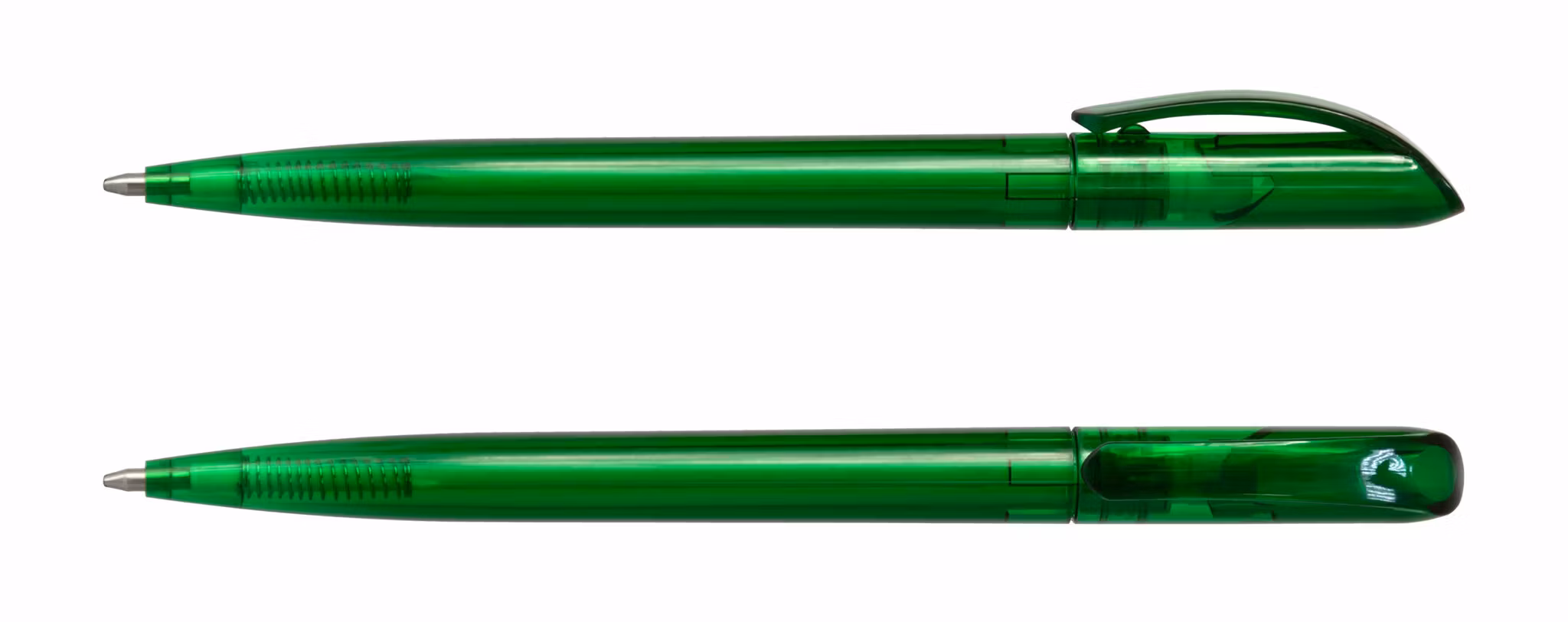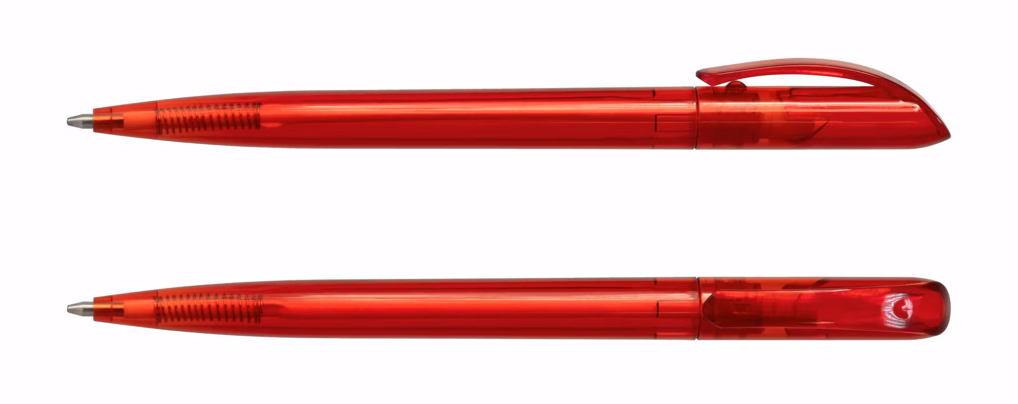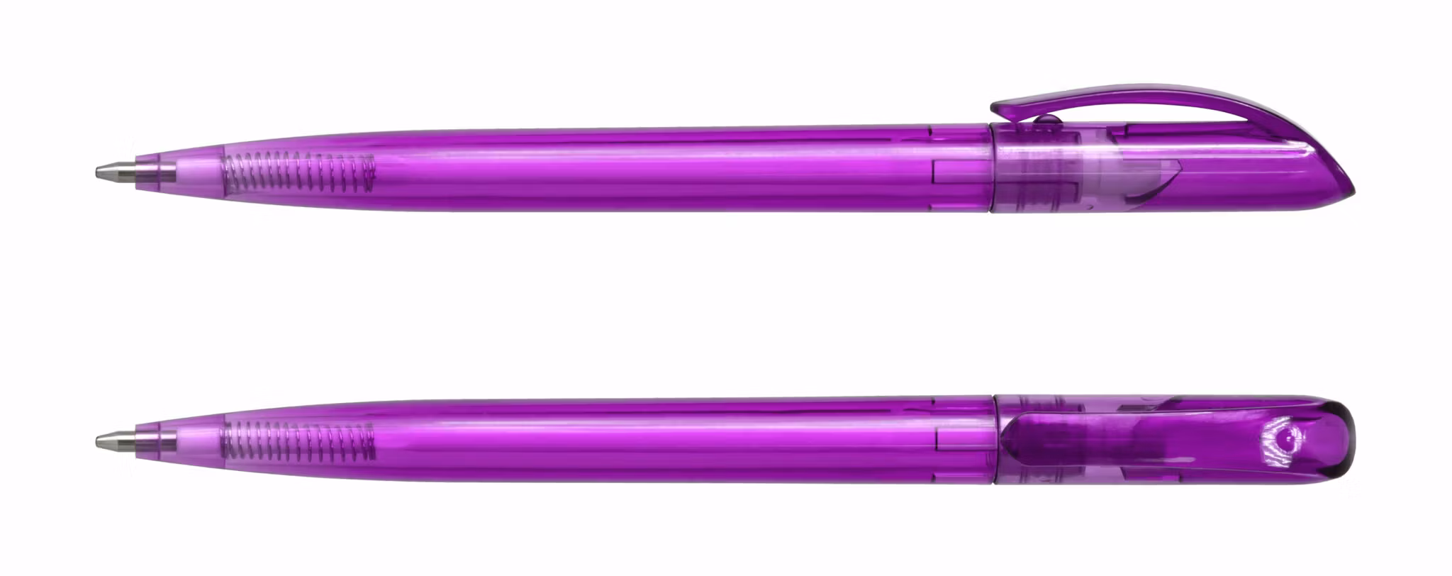 Plastpenna med vridmekanism. Välj mellan sju olika färger: vit och svart solid eller någon av de fem olika snygga transparenta färgerna.