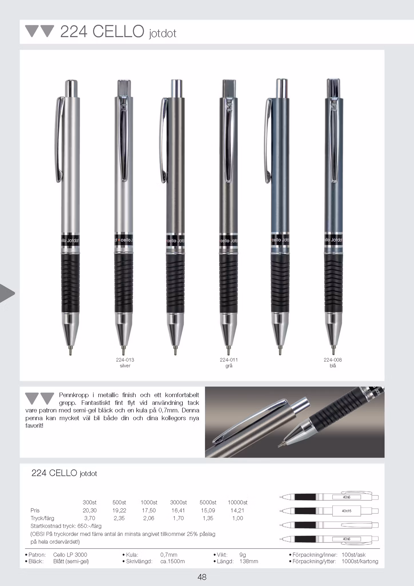 Patron: Cello LP 3000 / Bläck: Blått(semi-gel) / Kula: 0,7mm / Skrivlängd: ca 1500m Vikt: 9g / Längd: 138mm / Förpackning: 100st/inner och 1000st/ytterkartong