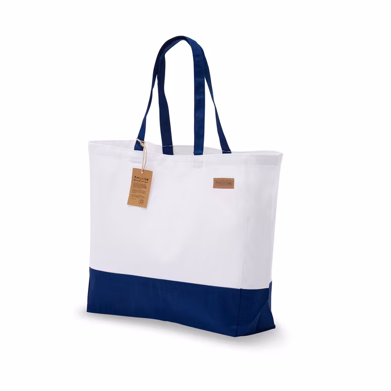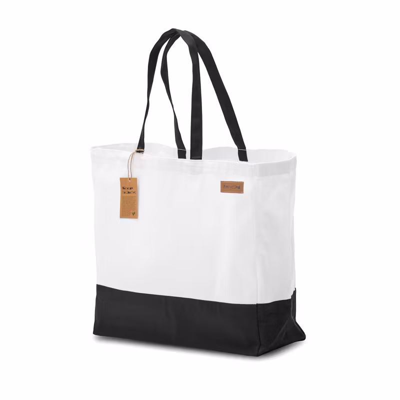 En rymlig bag i återvunnen bomull! Botten och handtag är mörkt infärgade. En funktionell designdetalj, då bagen håller sig fräsch längre, oavsett vilka utflykter den får följa med på! Handtagen är tillräckligt långa för att bäras på axeln. På hangtagen finns dess bakgrundshistoria och en kort sammanfattning om vad vårt CSR arbete med socialt ansvarstagande står för. Bagen är tillverkad av tyger från restpartier, stuvbitar och dylikt som tagits tillvara och vävts till nya kassar istället för att kasseras. Den återvunna bomullen bidrar till att världens sopberg hålls nere och att jordens resurser omhändertas på ett klokt sätt. Kassen är märkt med en fastsydd Recycle etikett på ena sidan, (omärkt på den andra sidan)