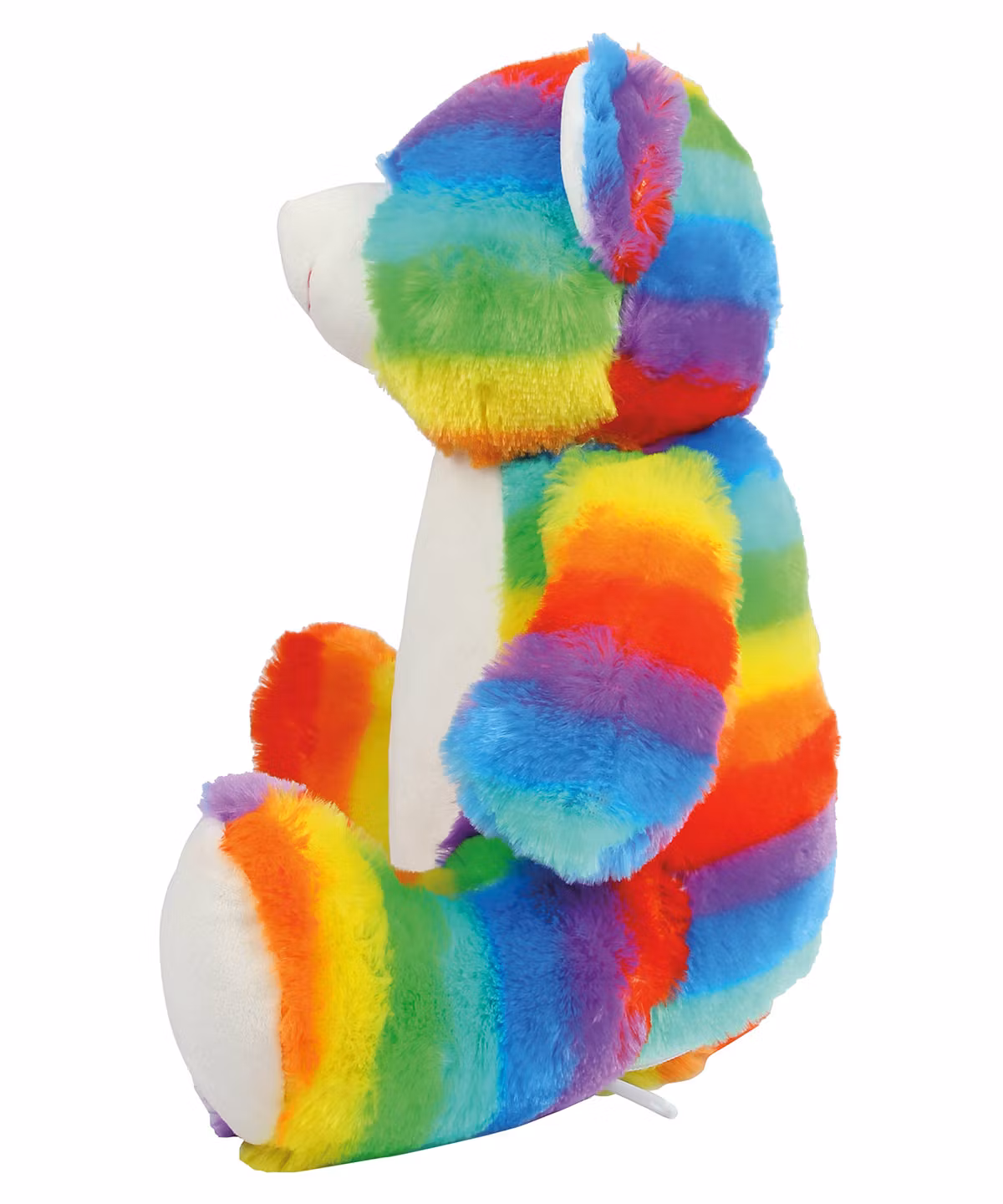 Multi-coloured soft plush bear. Contrast sewn nose and eyes. Cream coloured panel on tummy and feet. Zip access on base of bear for direct access onto the tummy for embroidery. Removable inner stuffing. Can be embroidered or sublimation printed. Complies with EN71 European Toy Safety regulations. Remove all hang tags and their fasteners before giving these items to a child. Suitable for children of all ages. BSCI certified. SEDEX certified.