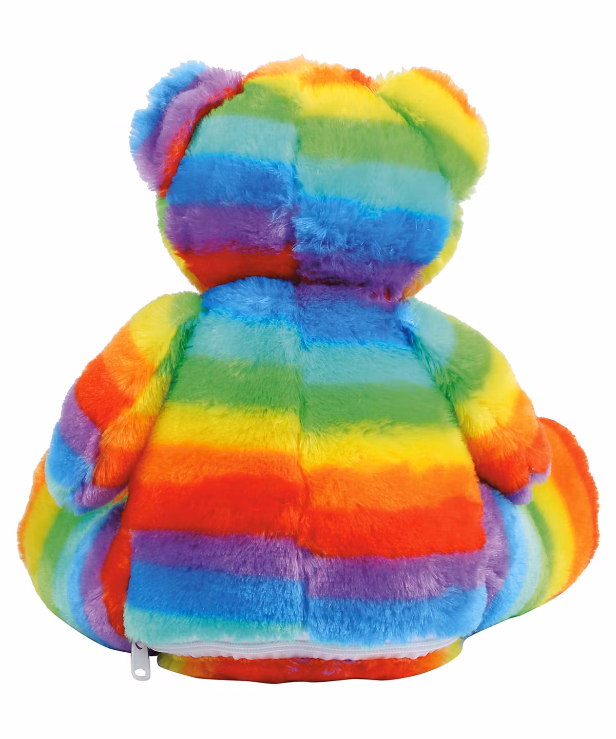 The multi-coloured soft plush bear has endearing contrast sewn nose and eyes with cream coloured panel on tummy and feet. Perfect for embroidery and sublimation printing with zip access at base.