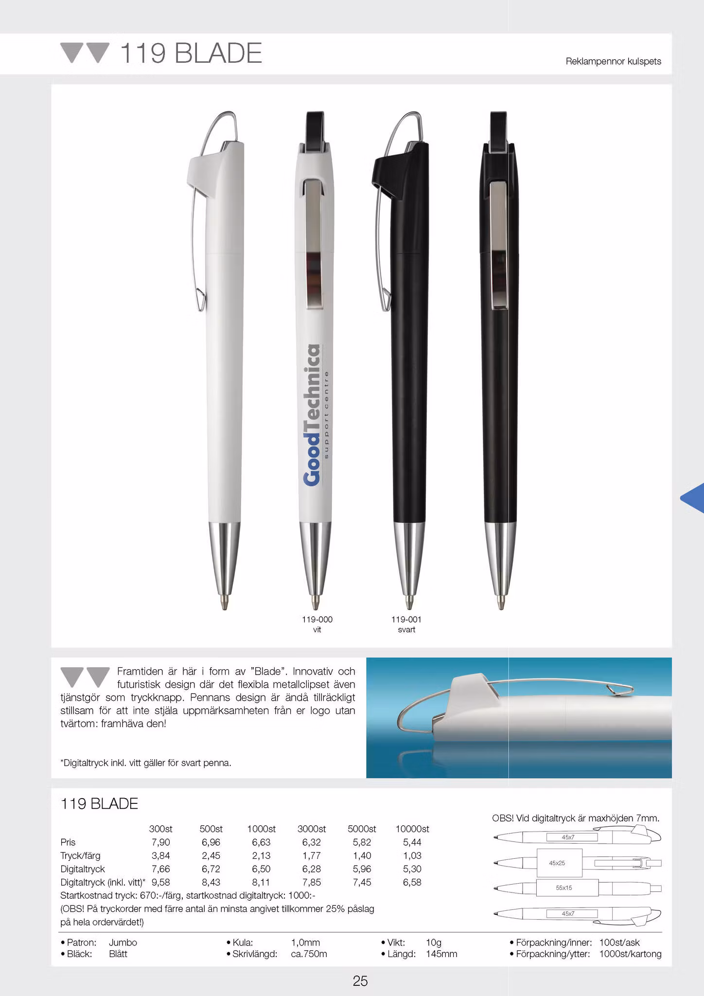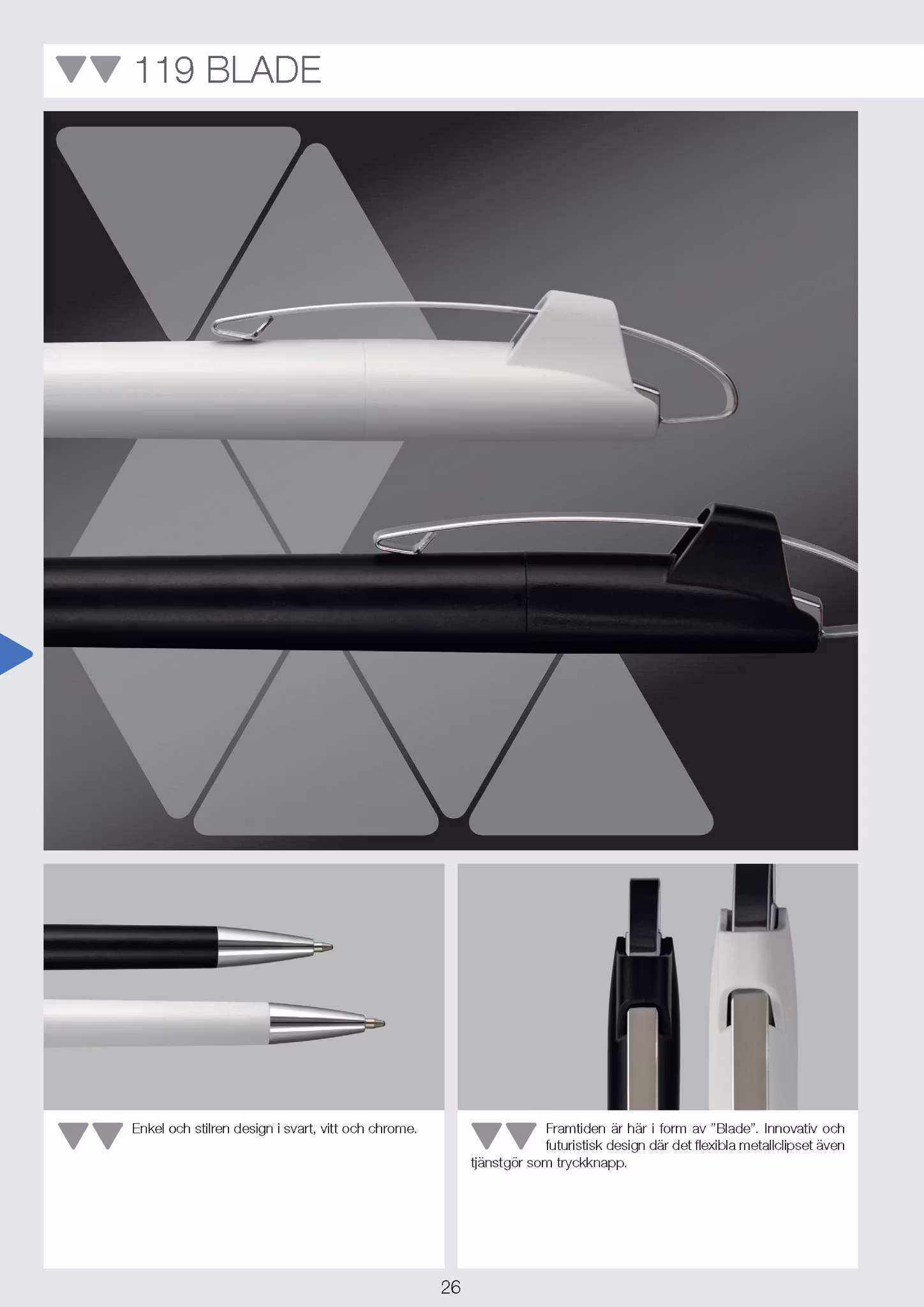 Framtiden är här i form av ”Blade”. Innovativ och futuristisk design där det flexibla metallclipset även tjänstgör som tryckknapp.