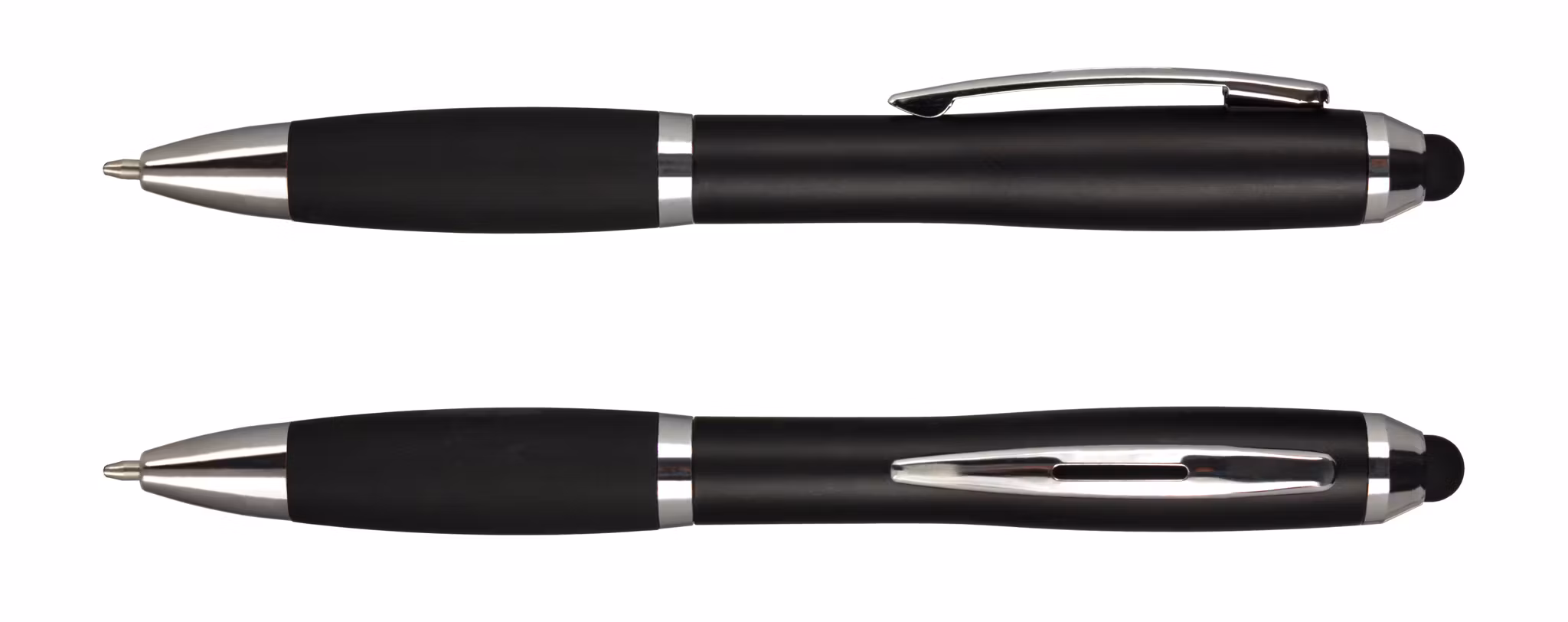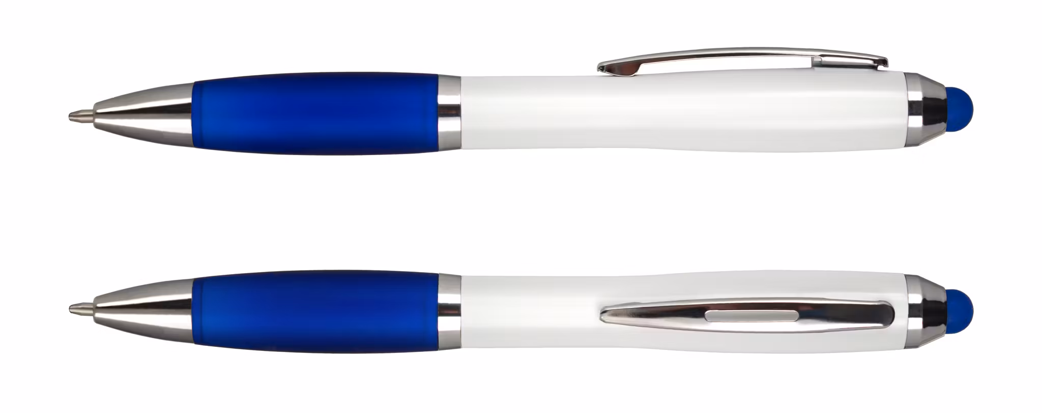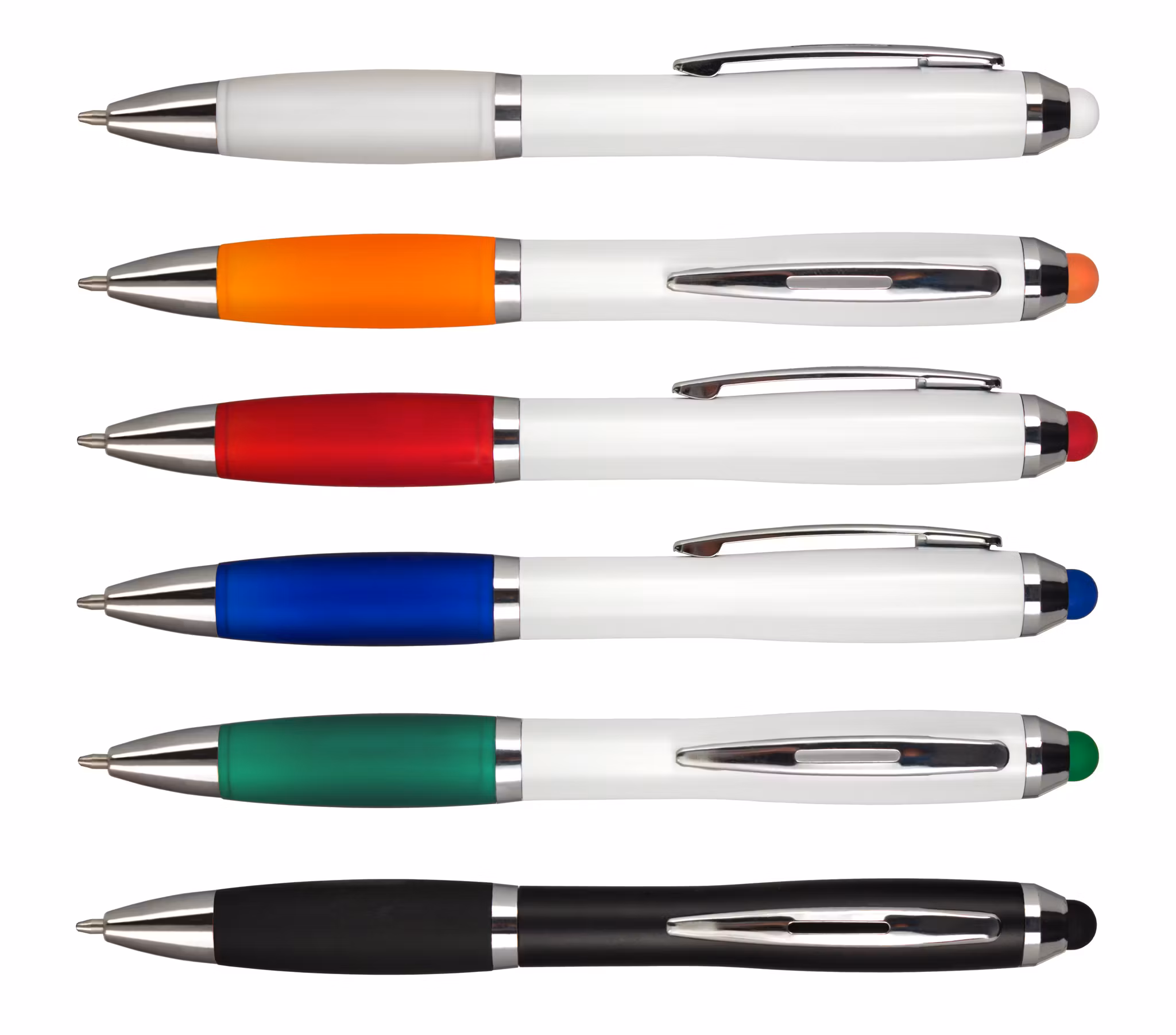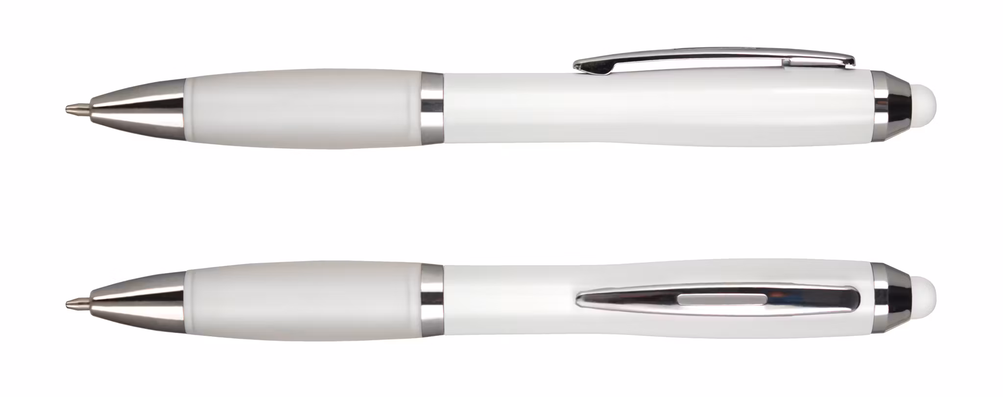 Midjeformad plastpenna med kromade detaljer, clips i metall och ett grepp med gummerad finish för extra skön komfort. Fem varianter med vit pennkropp för färgglada tryck, samt en helsvart.