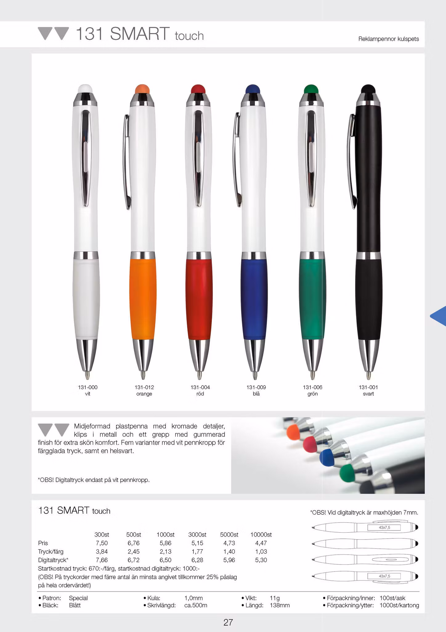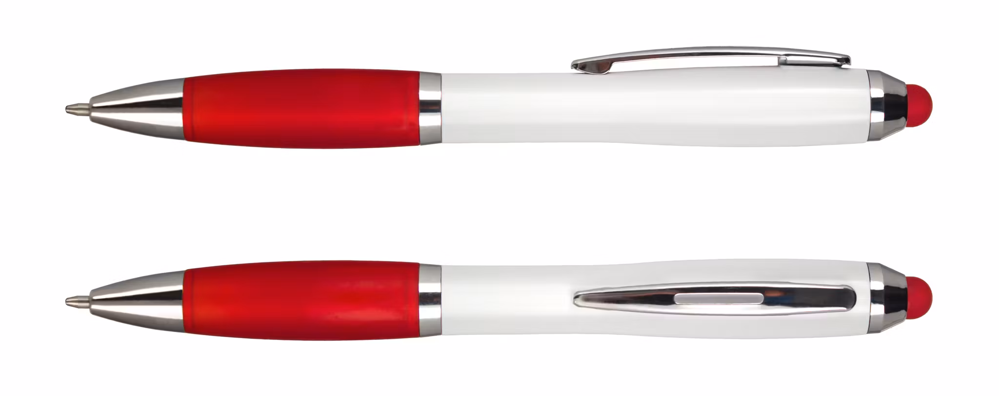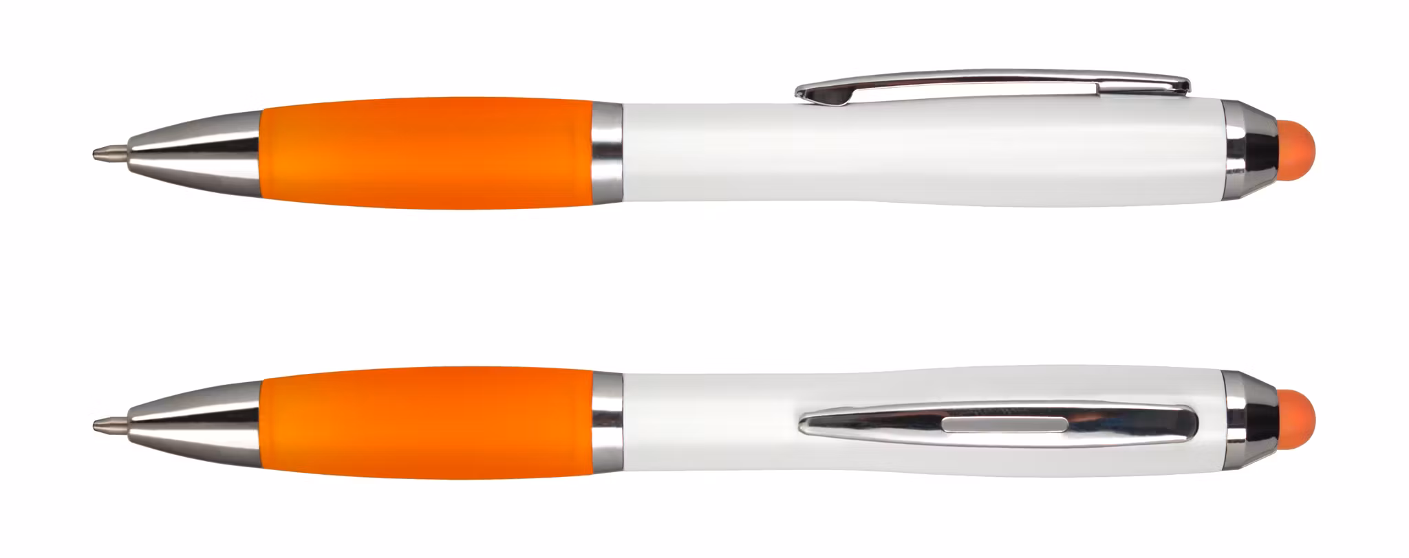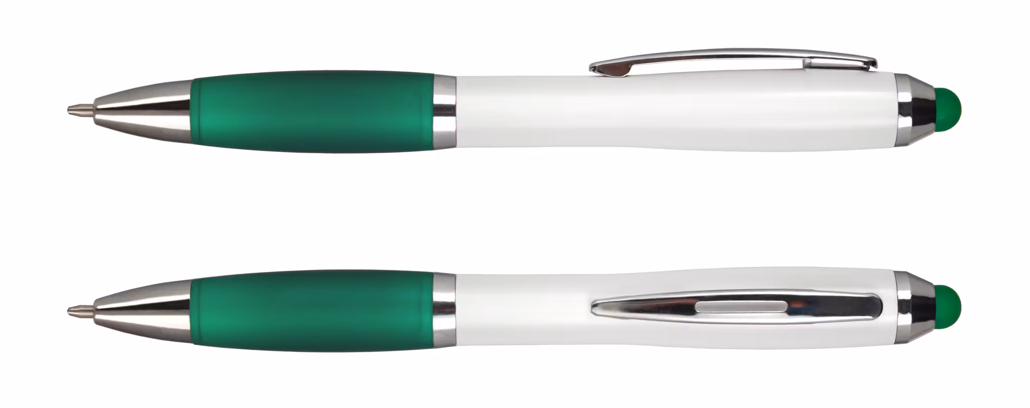 Midjeformad plastpenna med kromade detaljer, clips i metall och ett grepp med gummerad finish för extra skön komfort. Fem varianter med vit pennkropp för färgglada tryck, samt en helsvart.