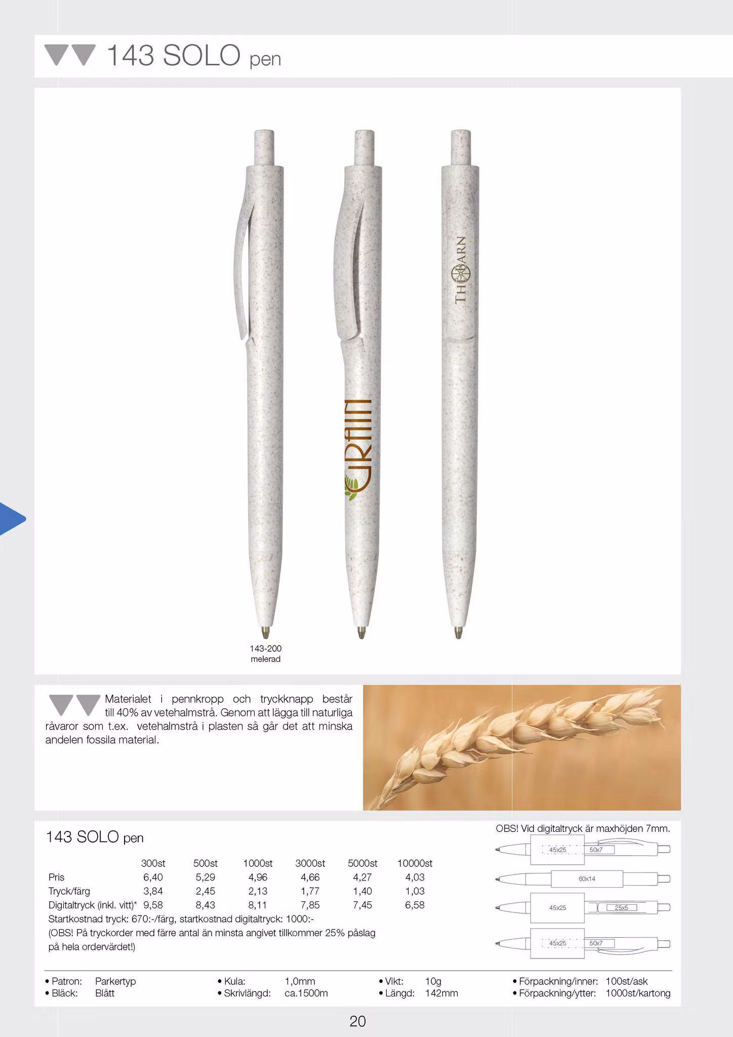 Ur miljöaspekt så är Solo pen ett bra alternativ då 40% av materialet kommer från förnybara växtfiber från vete.