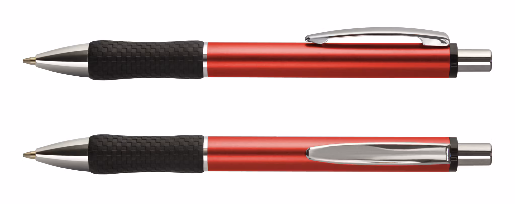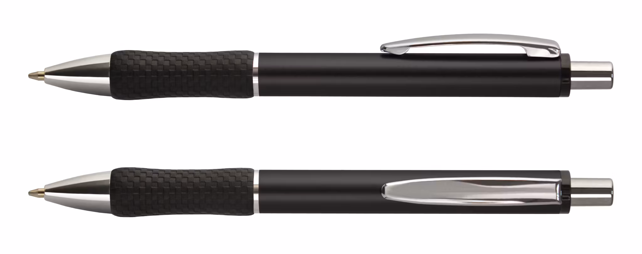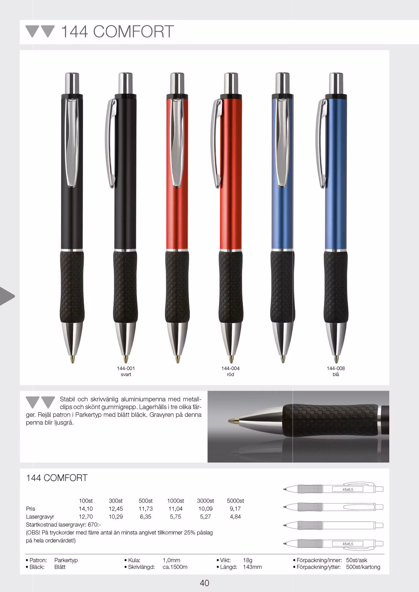 Pennkropp i matt eloxerad aluminium, distinkt ”klick” i mekanismen och ett bekvämt mönstrat gummigrepp kännetecknar pennan Comfort.