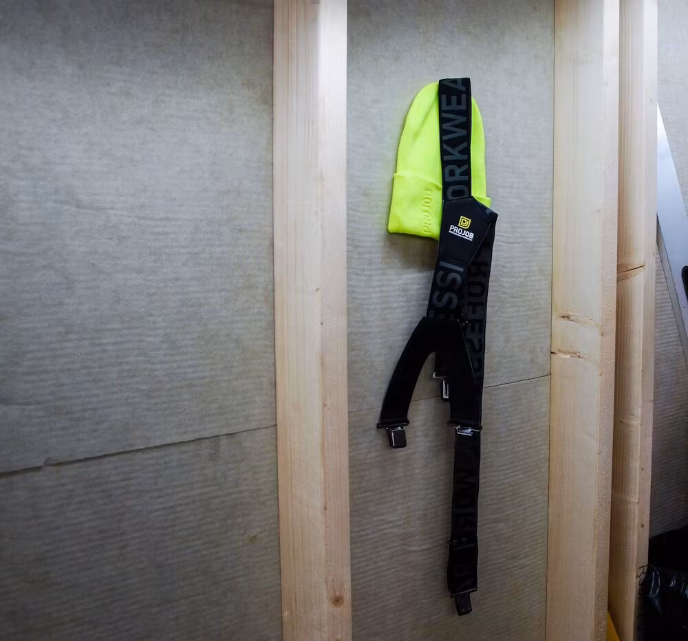 Slitstarka metallspännen både fram och bak som håller arbetsbyxorna på plats.