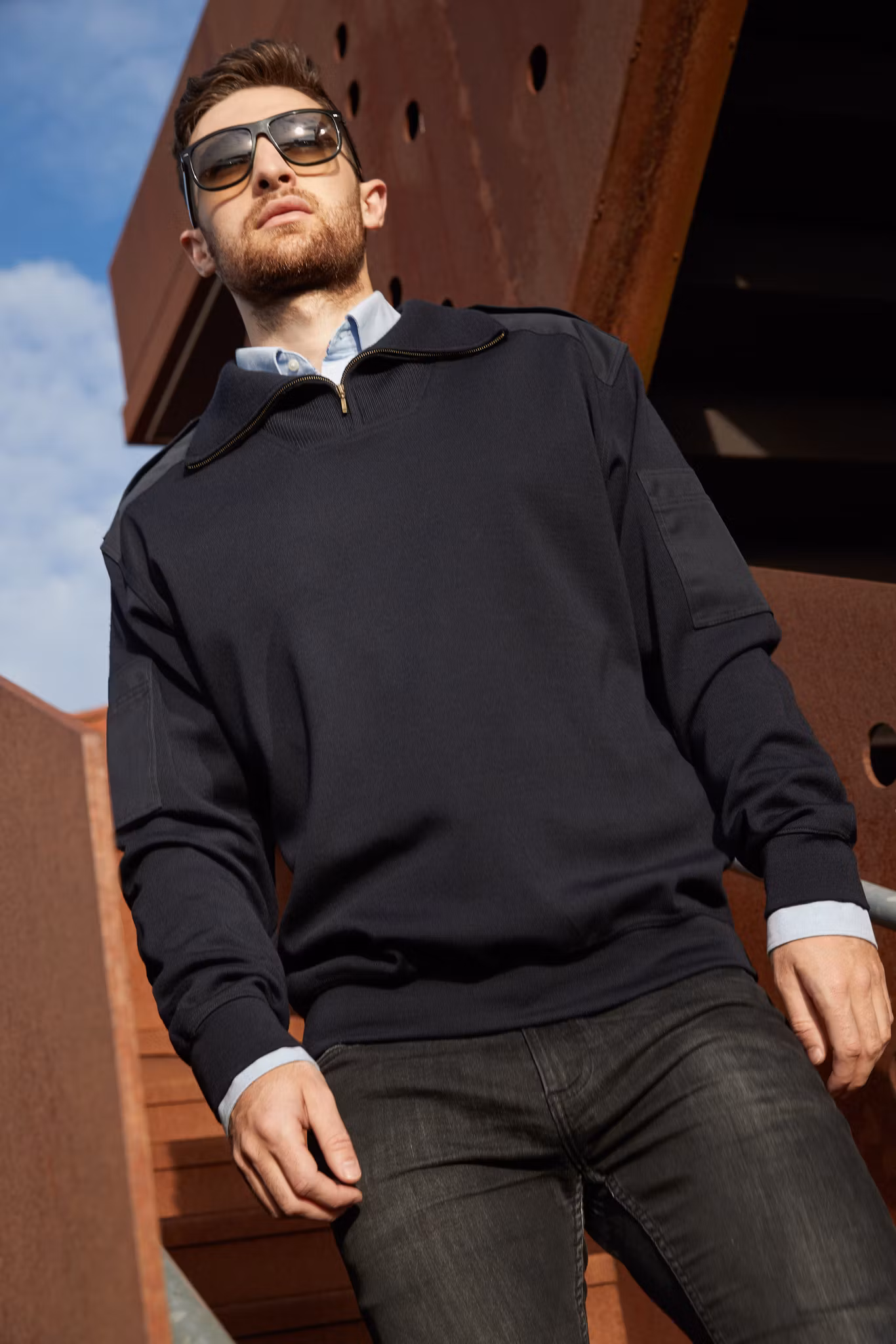 Oslo är tillverkad i en blandning av merinoull och akryl för en mjuk men hållbar kvalitet. Stickad i interlockstickning, vilket gör den väldigt robust. Den grova stickan säkerställer en tyngre stickning vilket gör den extremt formstabil. Pullover med dragkedja. Epauletter på axlar baserade på twilllappar för förstärkning. Dubbellagerstyg vid fåll, halsringning och ärmhål. Fickor på båda överarmarna. Med foder.
