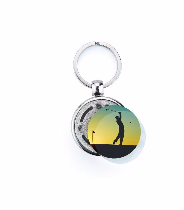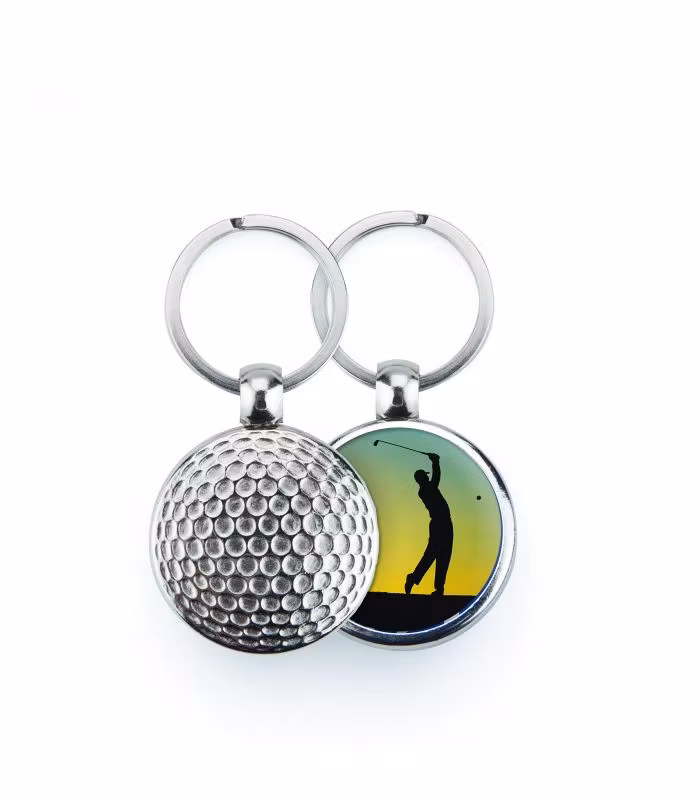 Denna golfboll-nyckelring är en originell och praktisk present för dem som gillar denna sport. Personlig på ena sidan och graverad som en golfboll på den andra.