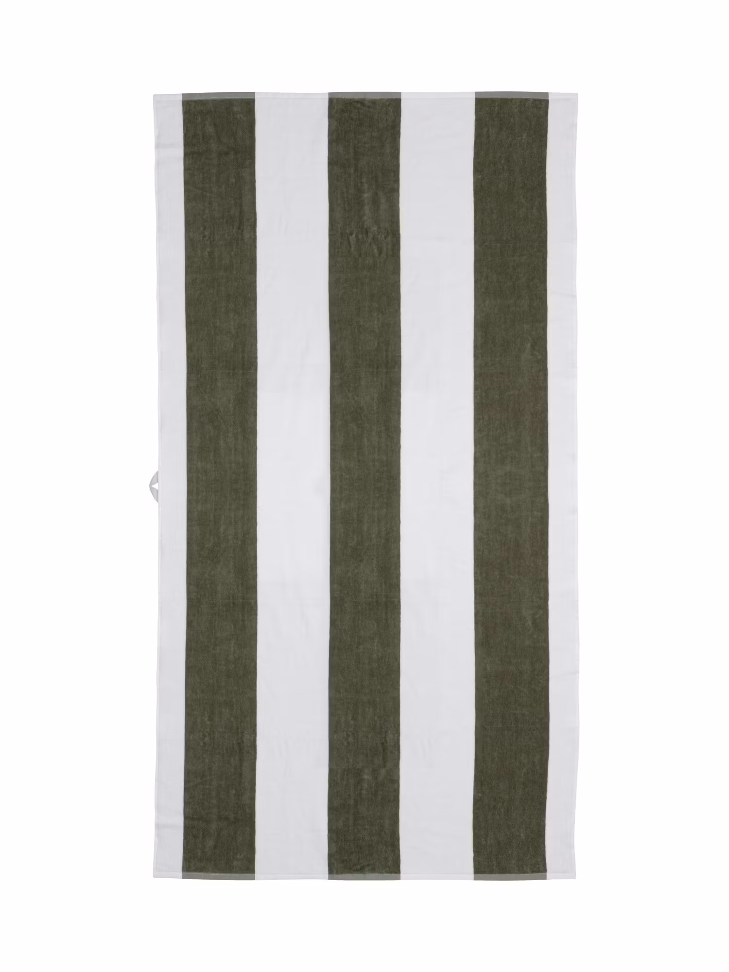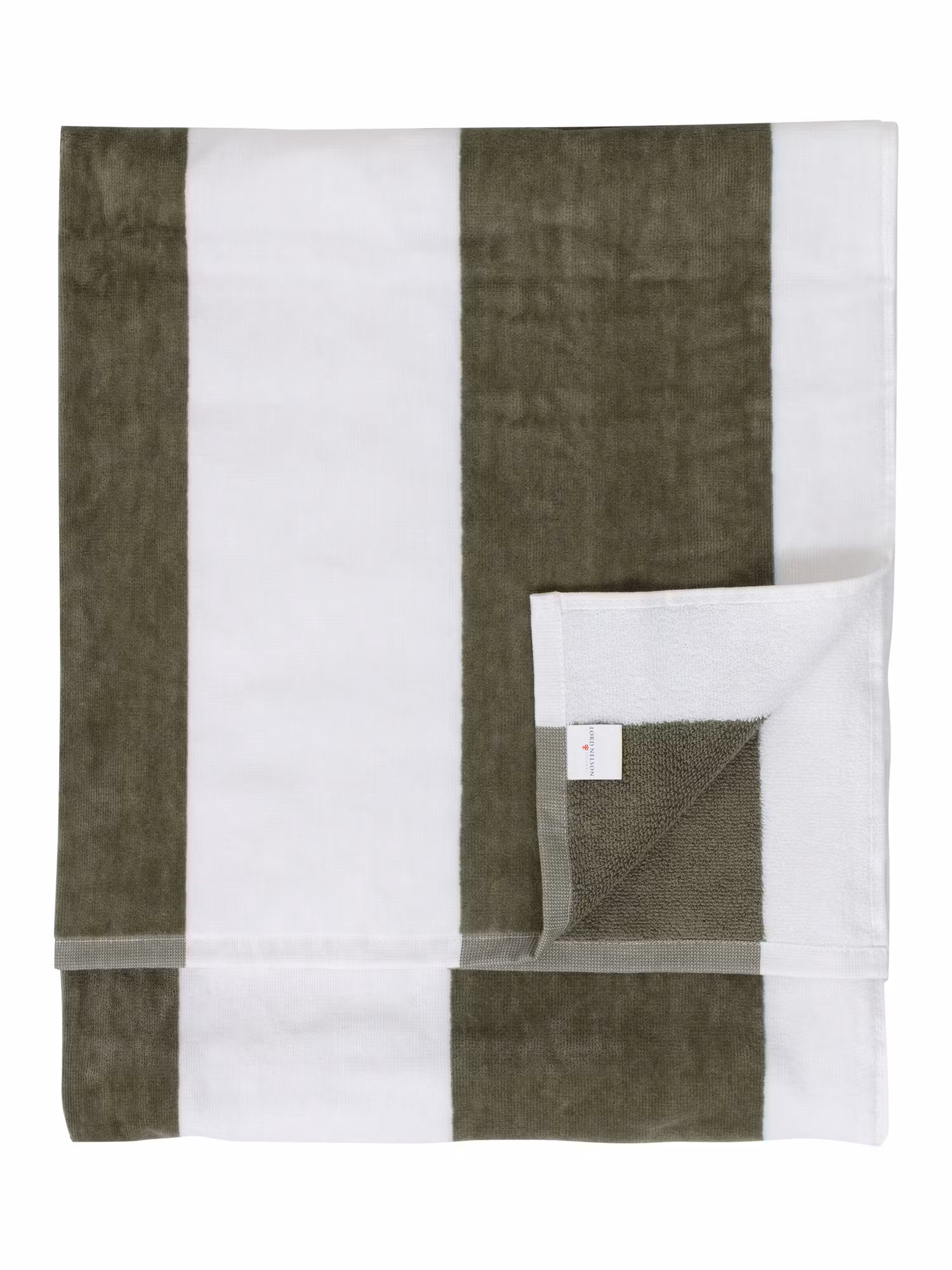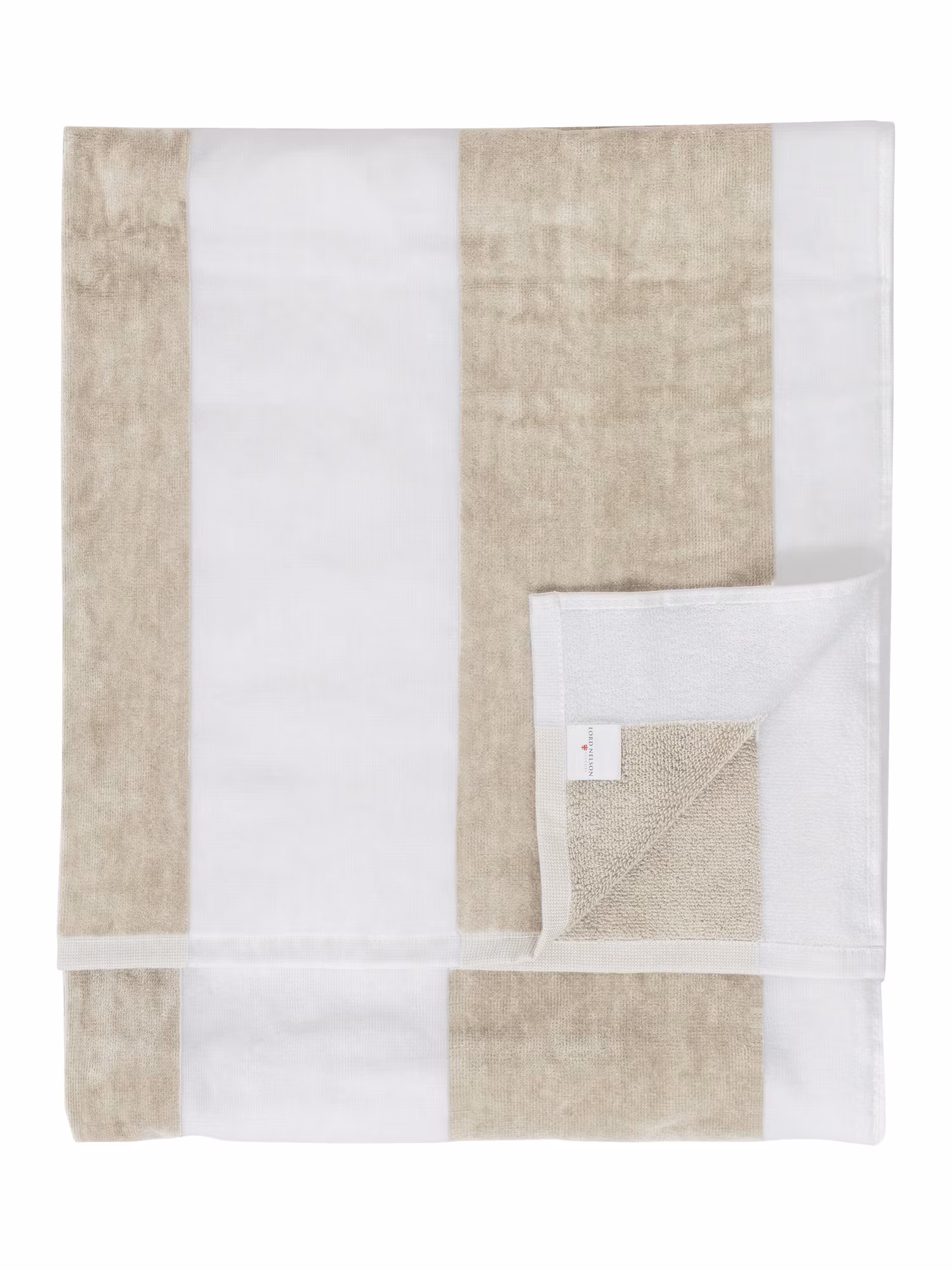 En klassisk strandhandduk i kraftig bomullsfrotté som tål sommarens alla äventyr. De breda ränderna ger en tidlös marin känsla och den generösa storleken gör den lika skön att ligga på som att svepa in sig i efter doppet. En självklar följeslagare från brygga till strand.