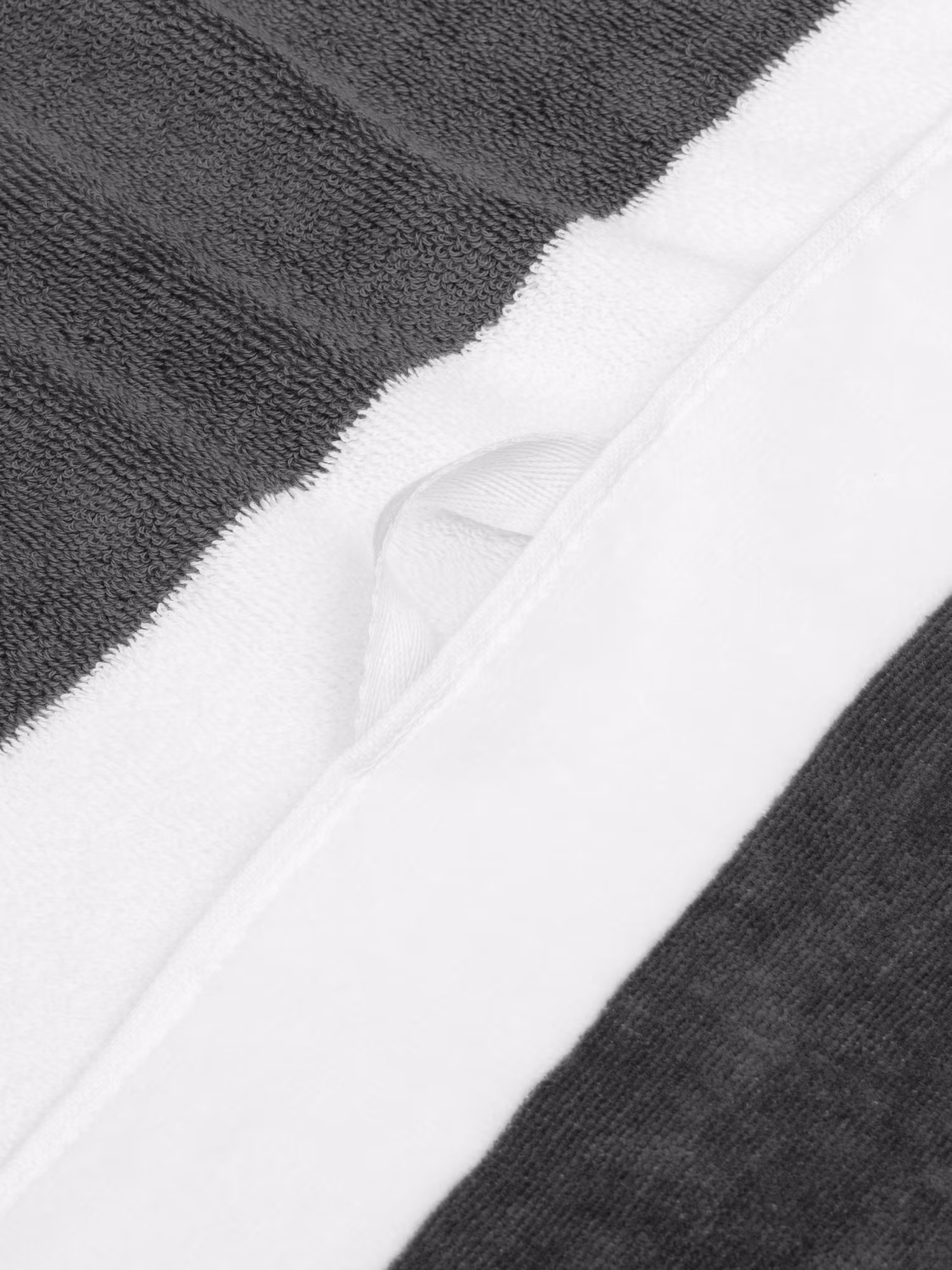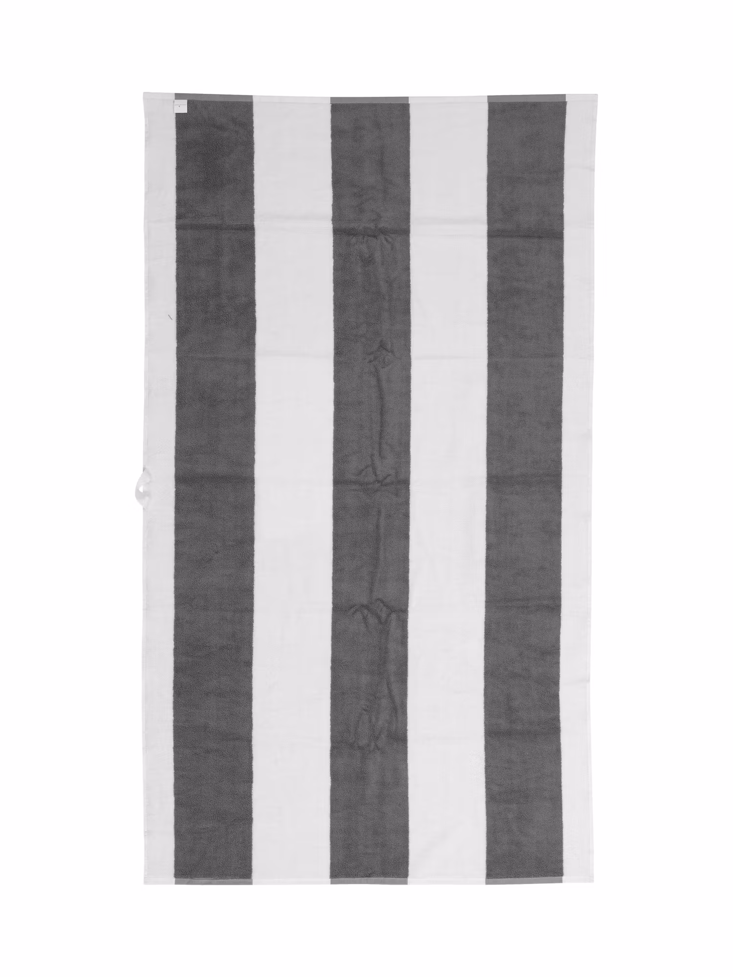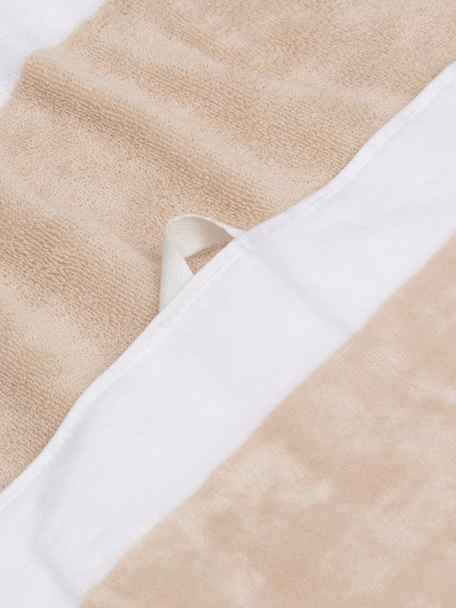 En klassisk strandhandduk i kraftig bomullsfrotté som tål sommarens alla äventyr. De breda ränderna ger en tidlös marin känsla och den generösa storleken gör den lika skön att ligga på som att svepa in sig i efter doppet. En självklar följeslagare från brygga till strand.
