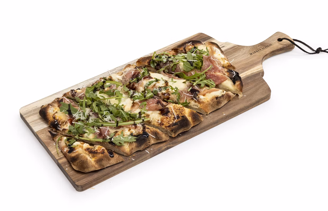 Elegant och trevlig bräda med handtag i oljad acacia. Anpassad storlek för pinsa eller liknande, storlek 48x20x1,5cm