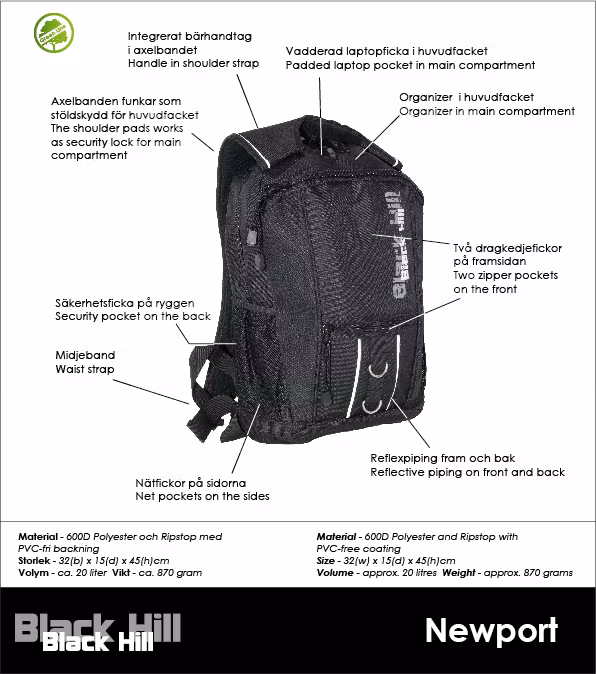 Newport är en ryggsäck som har miljövänligt material och med spännande streamlinad design. Den är utrustad med många smarta funktioner som säkerhetsficka, organizer, midjeband, reflexpasspoaler på fram och baksidan samt nätfickor. Ryggsäcken har nytänkande och stöldsäker design där axelbanden skyddar din laptop och andra ägodelar medan du bär ryggsäcken på ryggen.