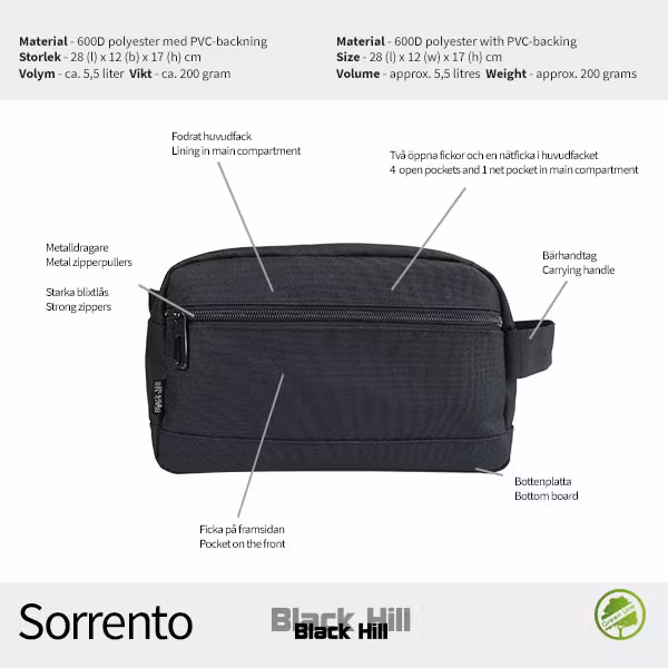 Rejäl necessär från Black Hill. Sorrento har en dragkedjeficka på framsidan och foder på insidan. Necessären har ett bärhandtag och 2-vägsblixtlås så den är lätt att hantera. Du får plats med det mesta du kan behöva ha med i det stora huvudfacket.