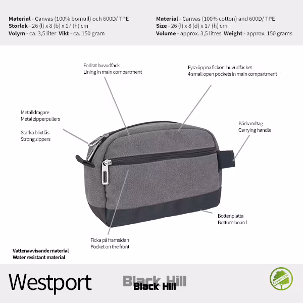 Mjuk och smidig necessär från Black Hill i vattenavvisande bomullscanvas. Westport har en dragkedjeficka på framsidan och foder på insidan. Necessären har ett bärhandtag och 2-vägsblixtlås så den är lätt att hantera. Du får plats med det mesta du kan behöva ha med i det stora huvudfacket.