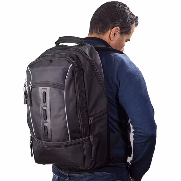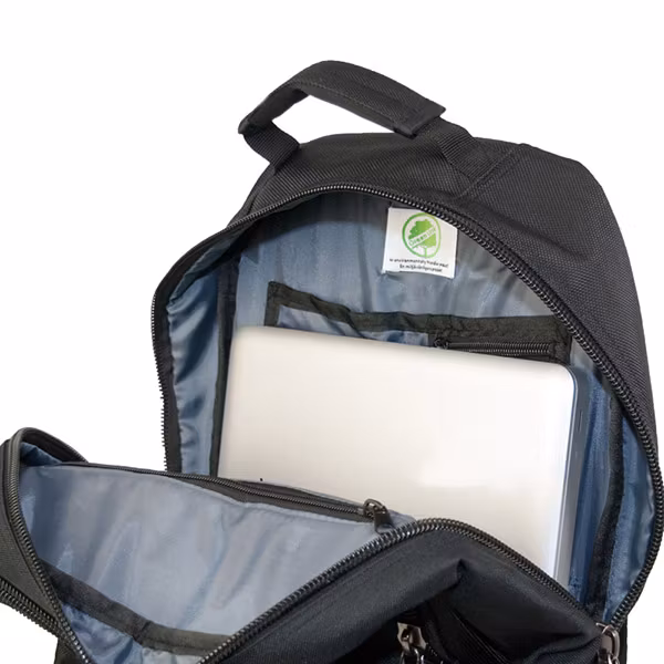 Den har en uttrycksfull design och innehåller en vadderad laptopficka, organizer i huvudfacket och en smart säkerhetsficka på baksidan.