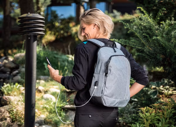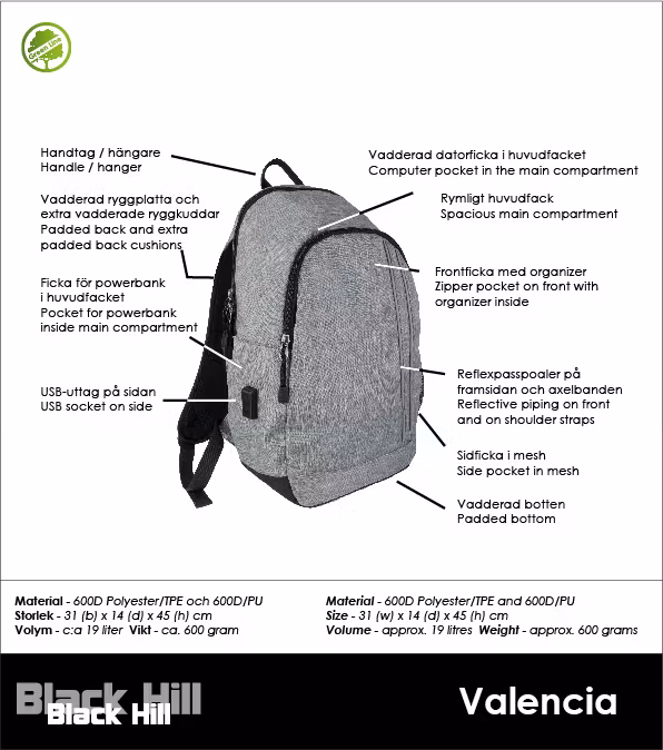 Den har till exempel reflexpasspoaler både fram och bak, organizer, säkerhetsficka, extra vadderat ryggparti, laptopficka i huvudfacket och anslutning för usb-kabel så att du till exempel kan koppla in mobiltelefon och ladda den om du sätter i en powerbank på insidan ryggsäcken. Den har dessutom en nätficka på utsidan och fint foder på insidan. Valencia är en ryggsäck av hög kvalitet som går under Green Line's miljökrav och passar till allt ifrån skola till arbete och fritid.