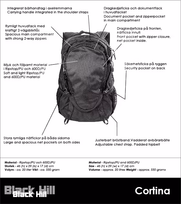 Cortina är en lätt och smidig sport-/fritidsryggsäck från Black Hill med oväntat många smarta lösningar och detaljer.