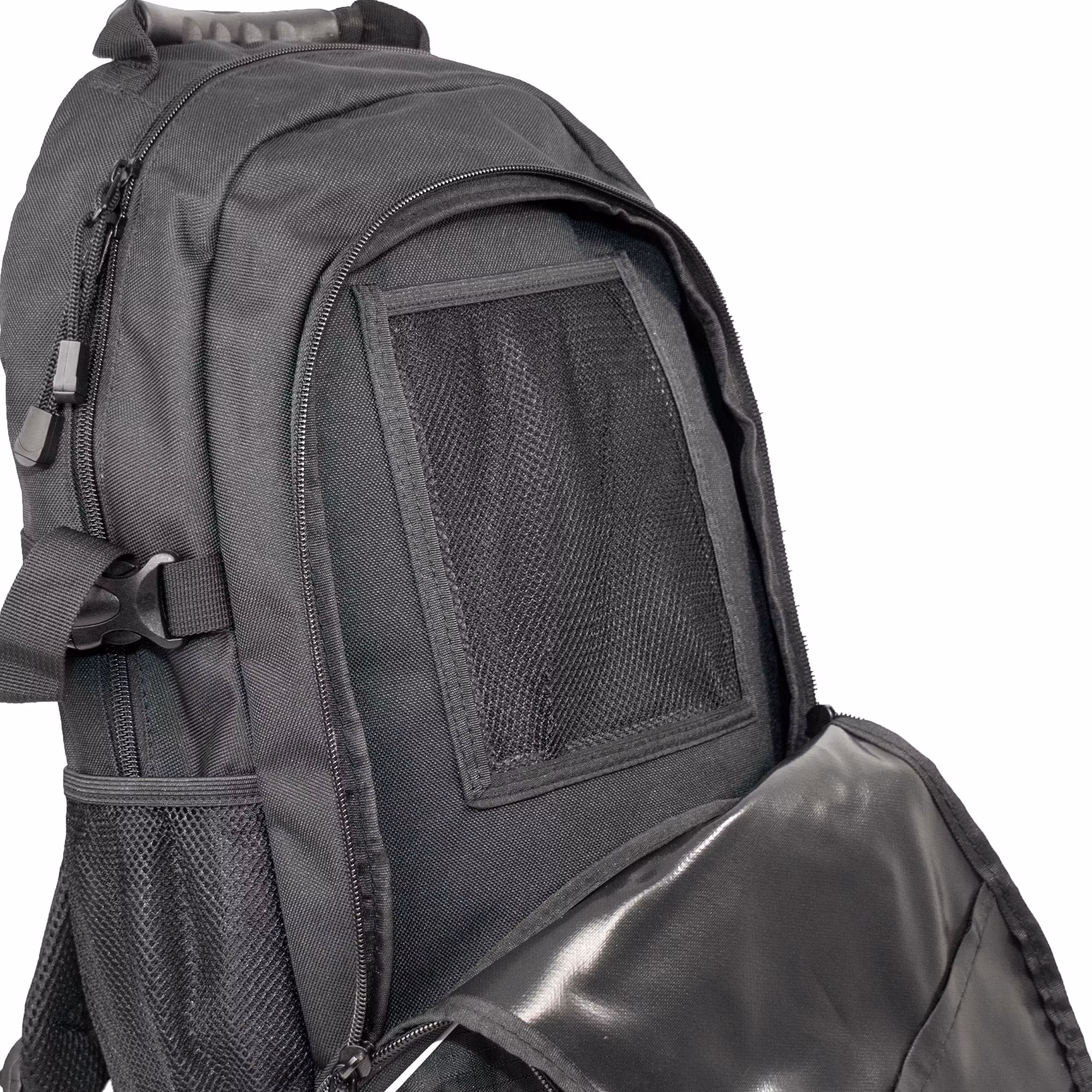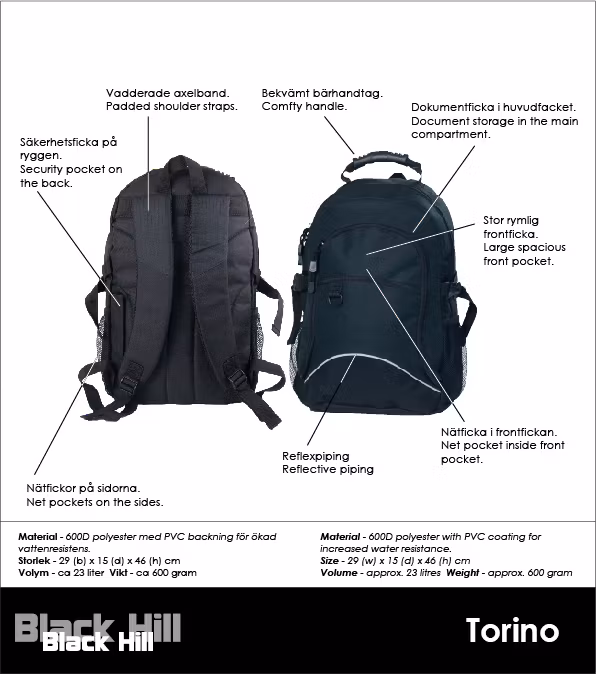 Torino är en rymlig ryggsäck från Black Hill med kraftigt bärhandtag i plast, hängare, säkerhetsficka för värdesaker, dokumentficka i huvudfacket, reflexpasspoaler och så vidare.