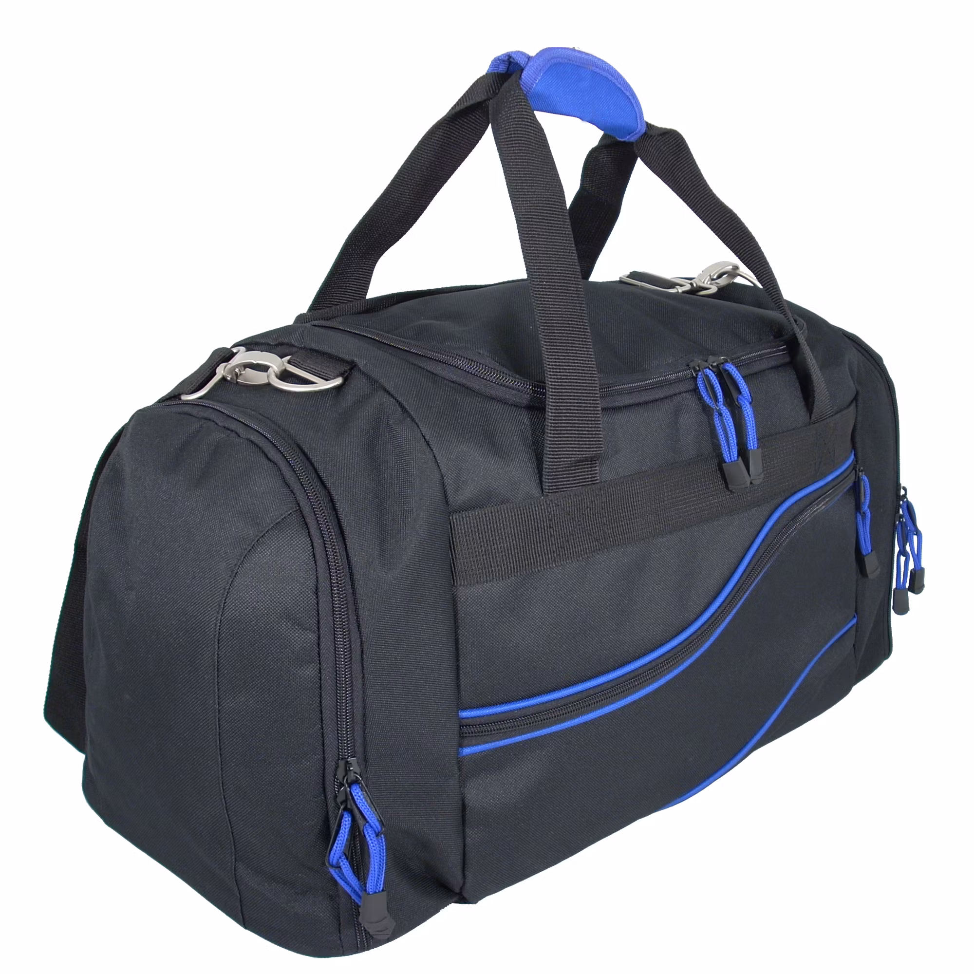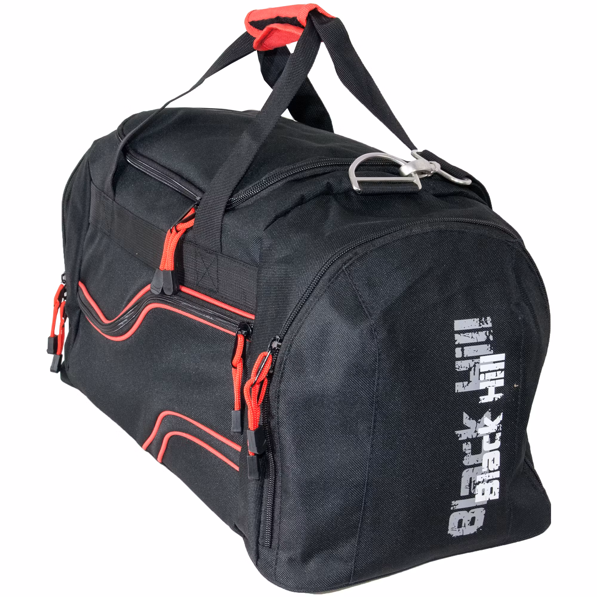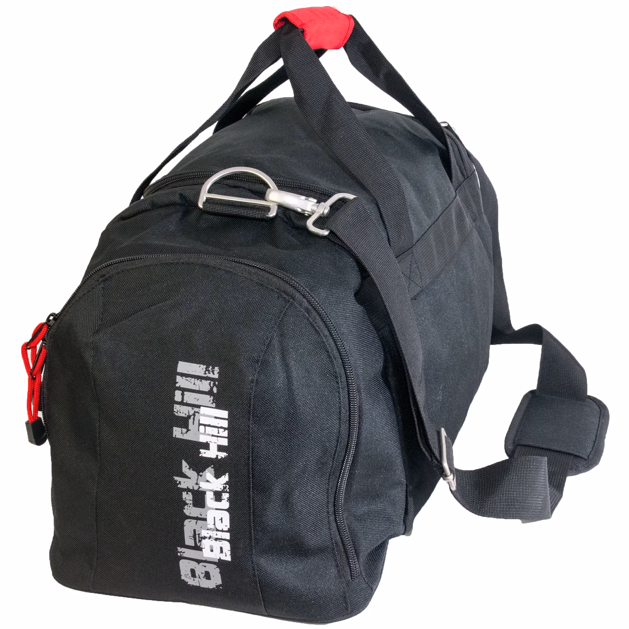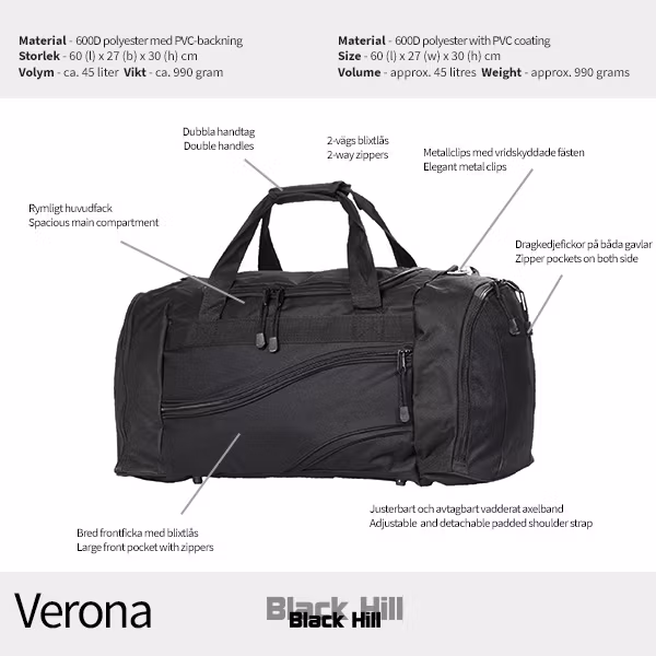 Verona är vår kanske populäraste sport och fritidsväska. Verona från Black Hill har stort huvudfack, rymliga gavelfickor samt dragkedjeficka på framsidan. Väskan har passpoaler på framsidan som ger en snygg look och gör väskan till en väldigt bra lagväska för idrottsföreningar och så vidare. Starka material och ordentlig sömnad tillsammans med bärhandtag, axelband med vadderad axelplatta och metallspännen gör denna väska till en riktig favorit!