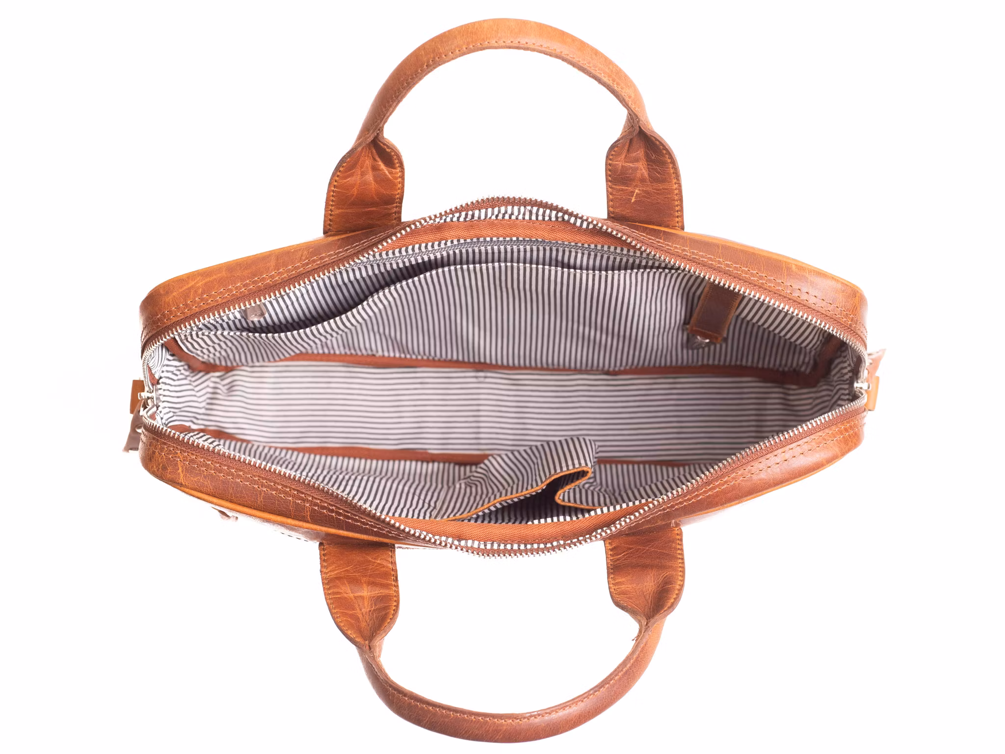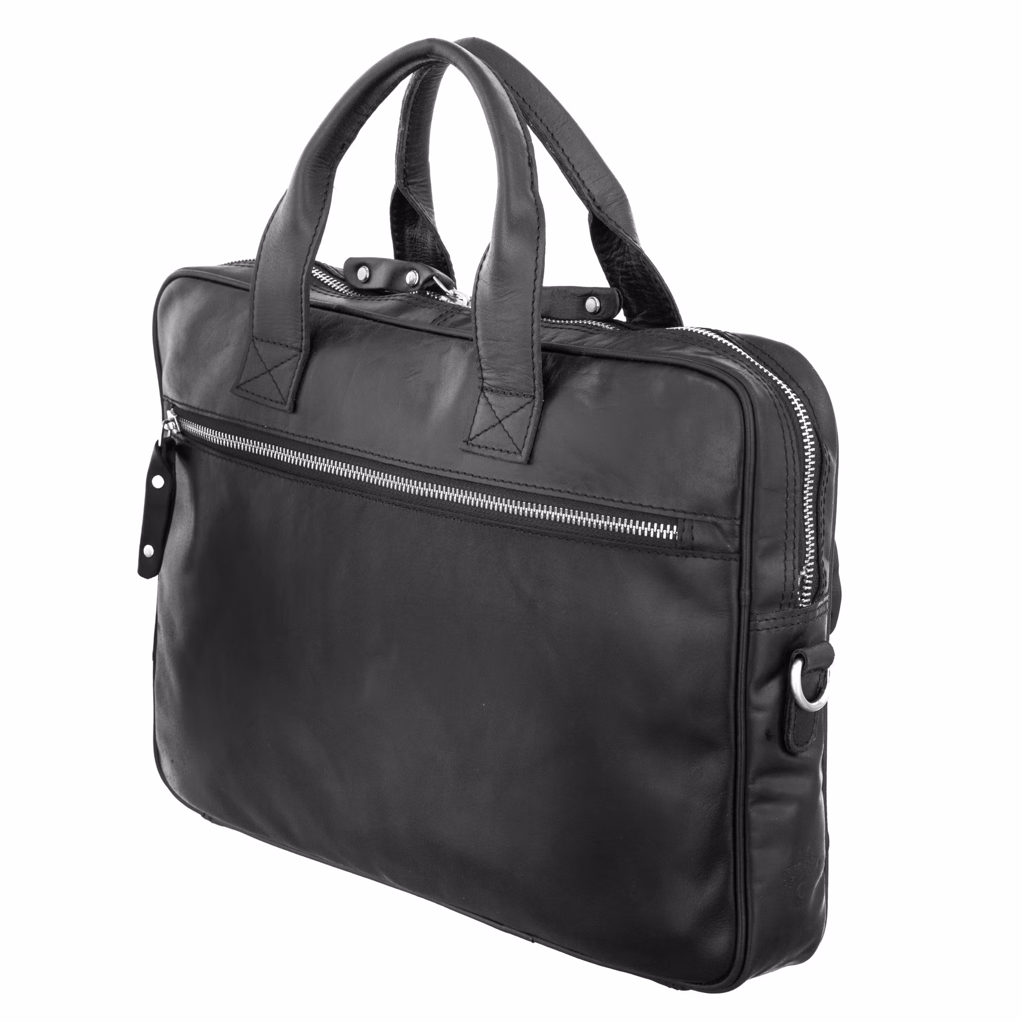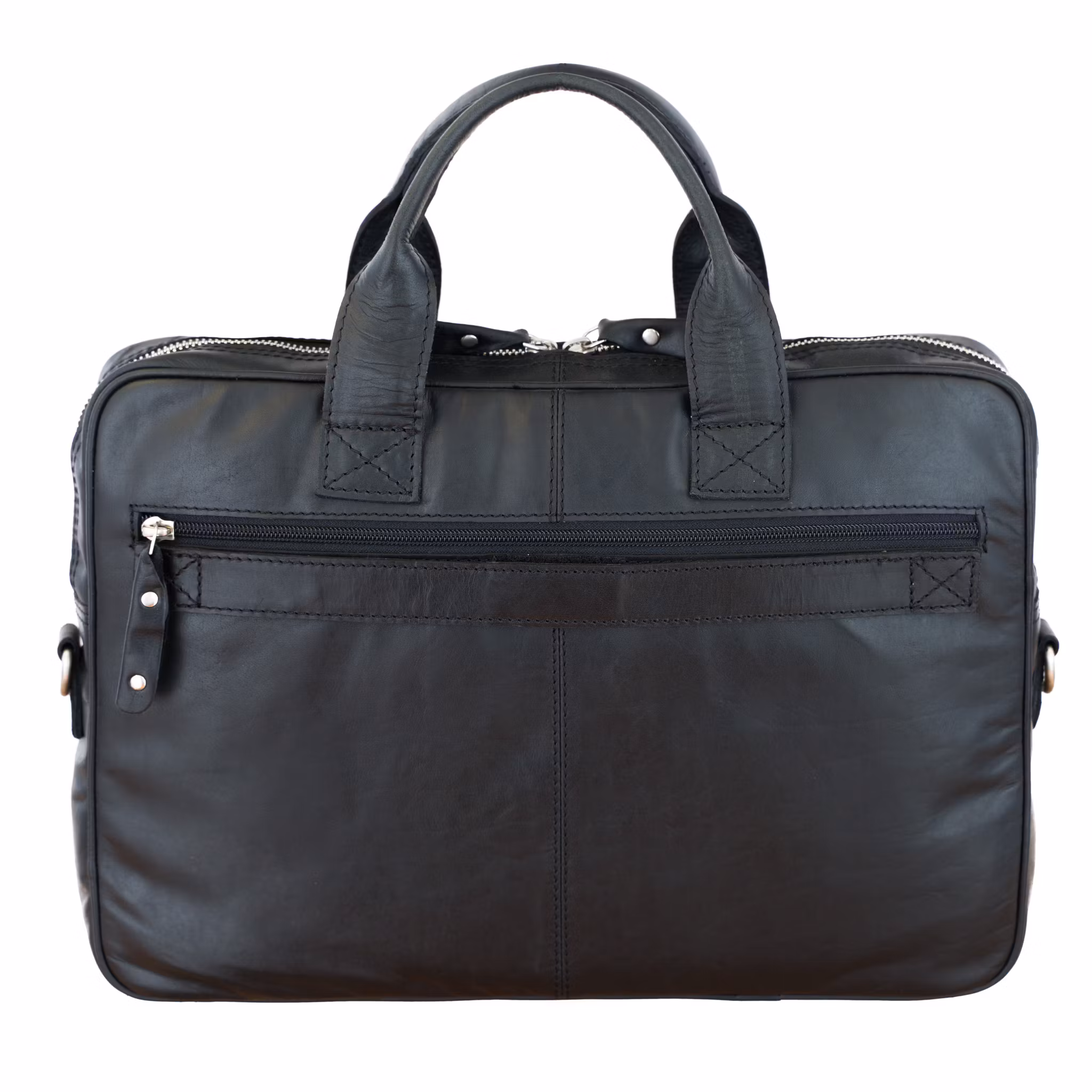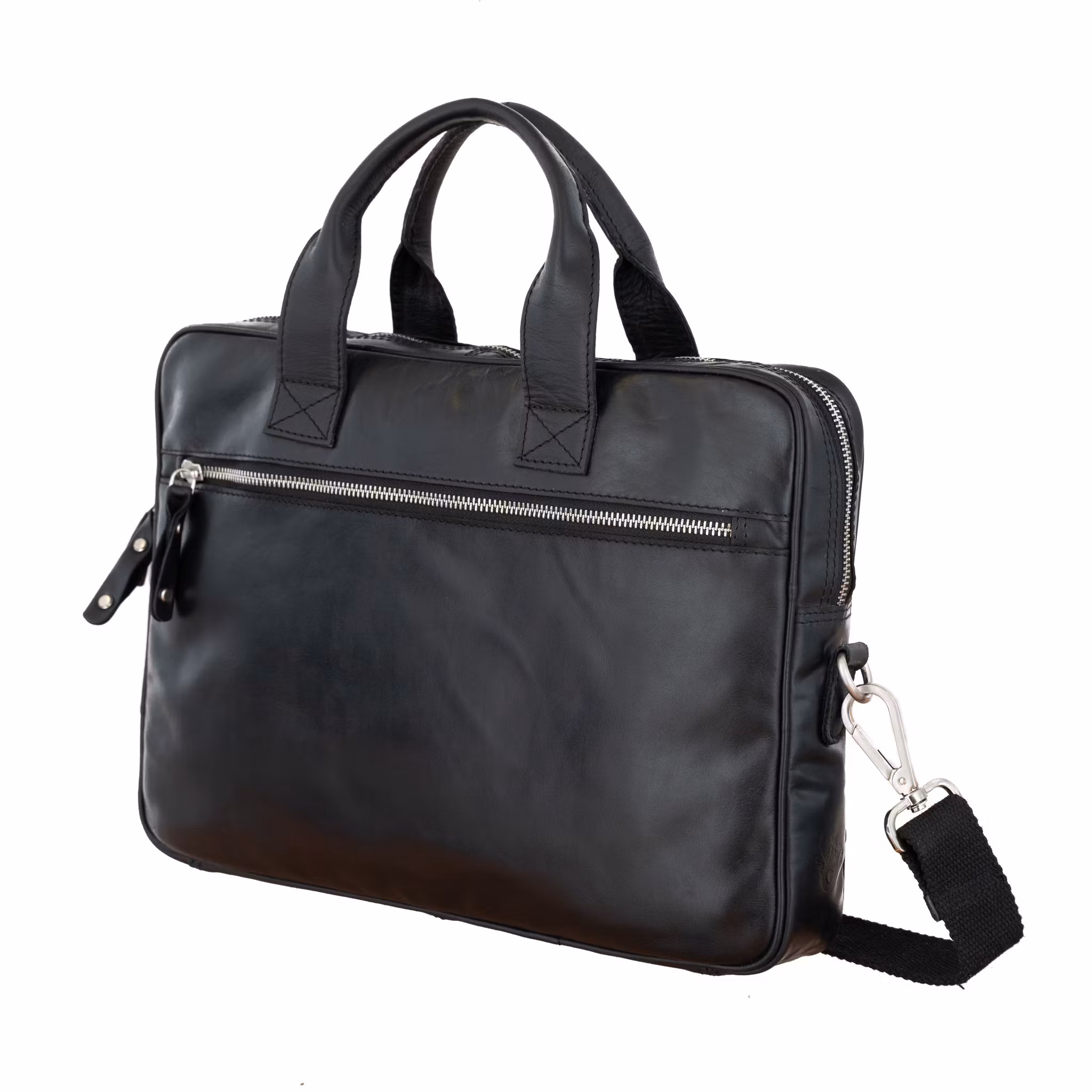 Tillverkad av ett mjukt buffelskinn. Lång ficka med dragkedja finns både fram och bak. Invändigt finns flera mindre fack, ett datorfack samt ett större fack med dragkedja. Avtagbar axelrem medföljer. Rem gör det möjligt att hänga väskan på en resväskas teleskophandtag.