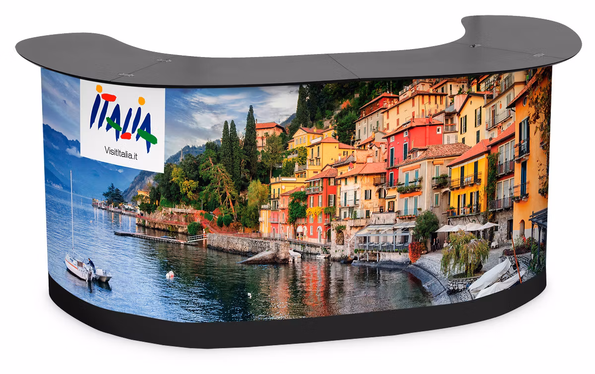 Transportbox och förvaring i ett. Podiumdisk som tål tuffa tag och som är enkel att transportera med de inbyggda hjulen. Enkelt montage av bildvåd med hjälp av medföljande kardborrefästen. Försedd med fyra stycken hyllplan samt bordsskiva i svart trä. I denna box ryms era rollups/mässväggar.
