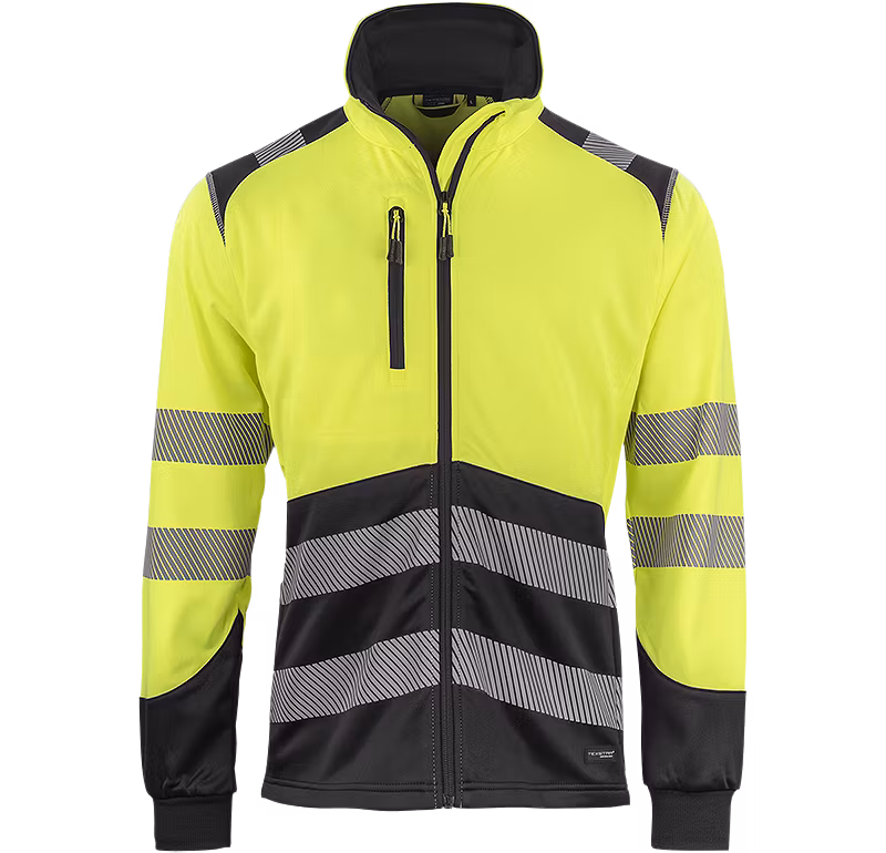 Modern varseljacka i omvänd fleece med borstad insida och slät utsida, utformad för att ge hög synlighet under alla ljusförhållanden. Insidans foder är skönt borstat och värmer hela vägen upp i den höga kragen. Sidfickor med blixtlås och är meshfodrade. Bröstfickor med blixtlås och ID-kortshållare. Jackan är designad för att klara nedsmutsning utan att tappa varselegenskaperna. Miljömärkt Oeko-Tex standard 100.