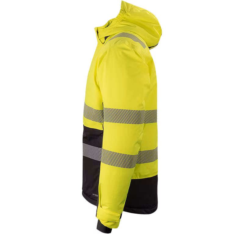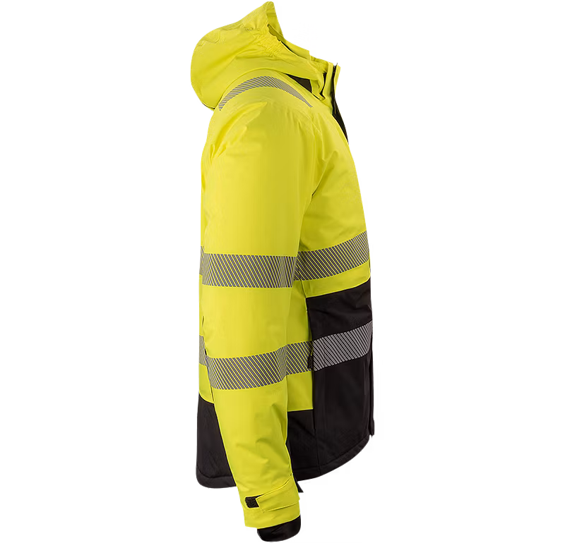 Material: Hi-Vis gult: Yttermaterial i 100 % polyester, tejpade sömmar, vattenpelare 10 000mm / andning 10 000 g/m2/24h. Ger synlighet under alla ljusförhållanden enl EN ISO 20471, klass 3.
