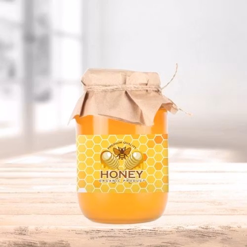 Labels for honey in the selected size are printed on a white semi-gloss paper with a standard glue, based on an individual graphic design.